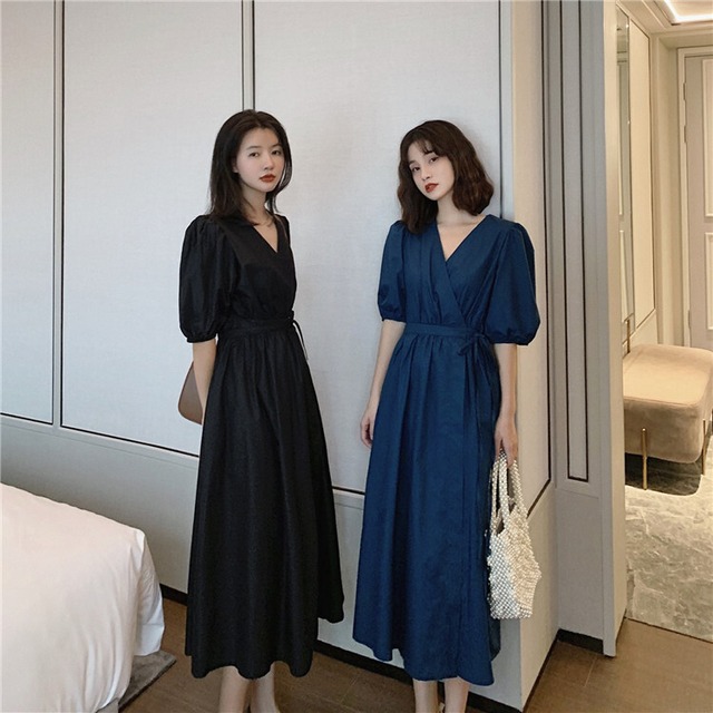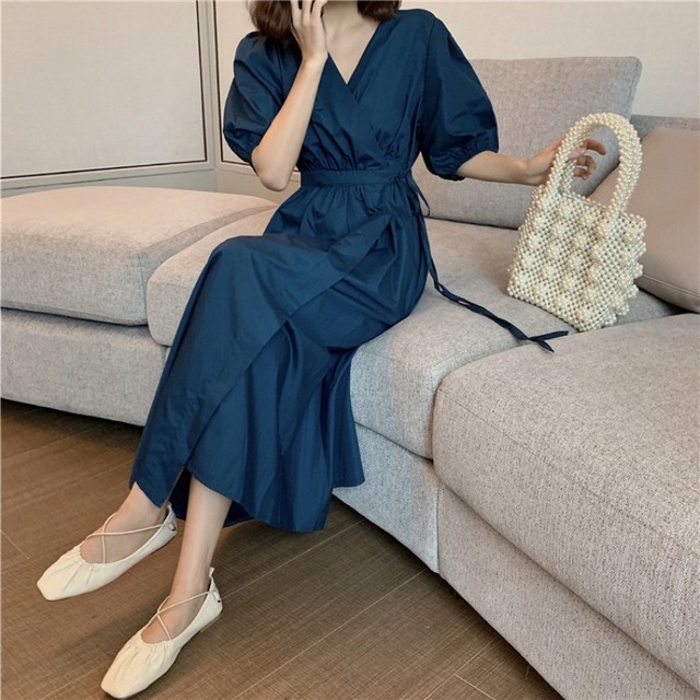 Vネックパフスリーブ、カシュクール、ロングワンピース。女子会、デート、お出かけにオススメ。好きなシーンに役立つ頼もしい1枚。