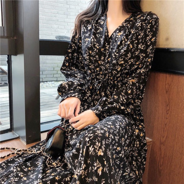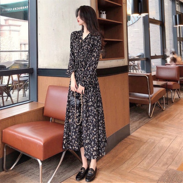 小花柄のシフォンロングワンピース。お出かけしたくなる最強アイテム。キレイ度アップ。秋の新着ワンピース。