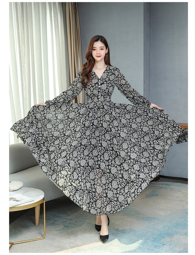 たっぶりフレアーの花柄ロングワンピース。大人セレブ。ゴージャス感UP。デートなどここぞ!という時に着たいワンピース。