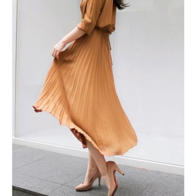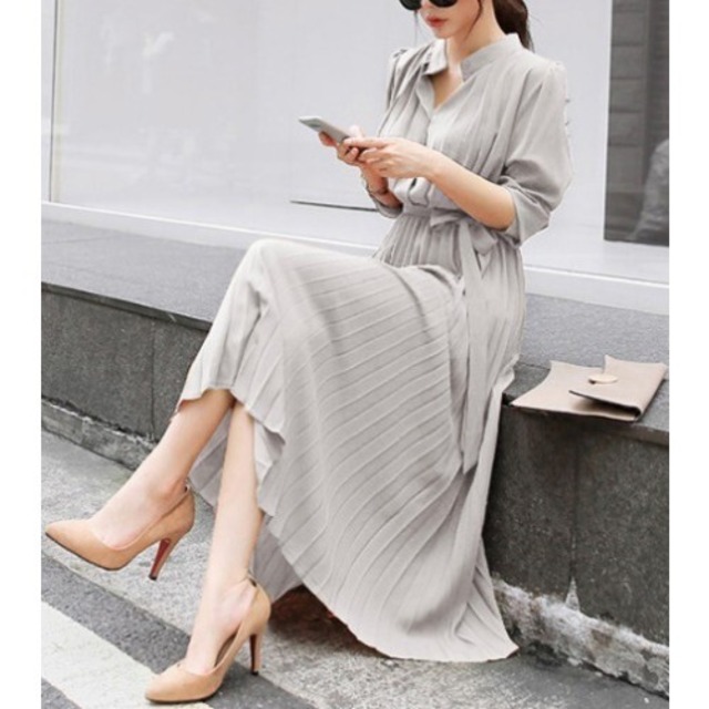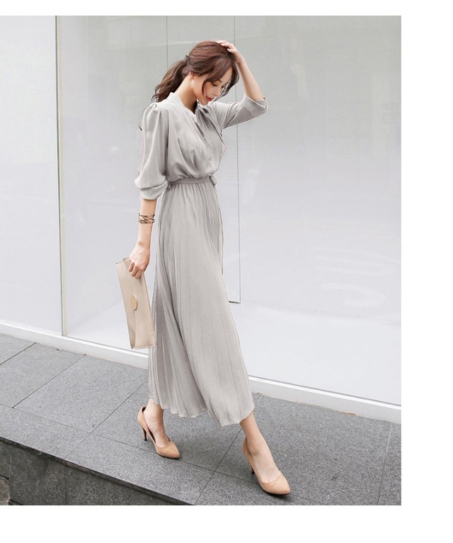 2020秋、スタンドカラー、プリーツスカートワンピース。キチンとした印象で。オフィスシーン、お出かけ、女子会はおまかせワンピース。
