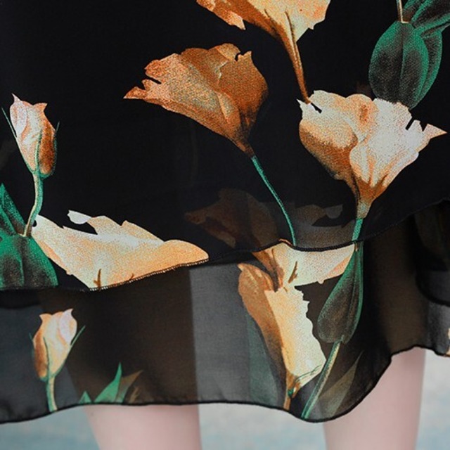 ワンピース+ボレロのセットアップ。ハイウエスト・Aライン・ミドル丈花柄黒ワンピース。何にでも合わせやすいボレロは、ブラックとオレンジを用意しました。かしこまったお出かけにオススメ。