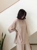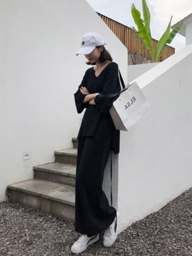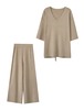 ドロップショルダーVネック七分袖セーター、両サイドスリット+ワイドパンツのセットアップ。2020秋にふさわしい着まわしのきくアイテム。