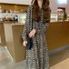 2020秋 長袖ドット柄ティアードロングワンピース。ゆったり着やせ。ジャケットインにも取り回ししやすいデザイン。秋のお出かけに最適。