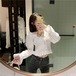スクエアネックパフスリーブブラウス。胸からウエストにかけてのシャーリングでスリム効果。オンタイムにもカジュアルにも、コーディネイトや小物で着まわせる1枚。