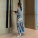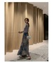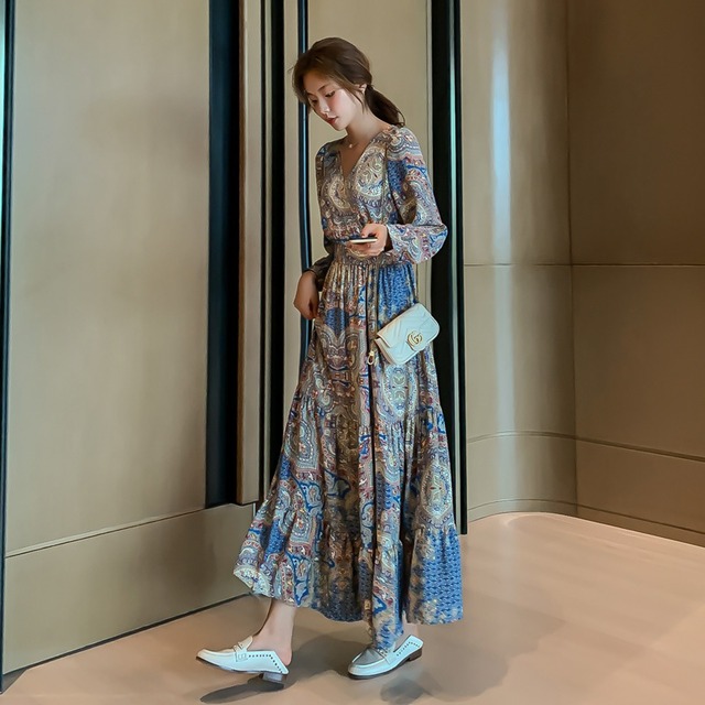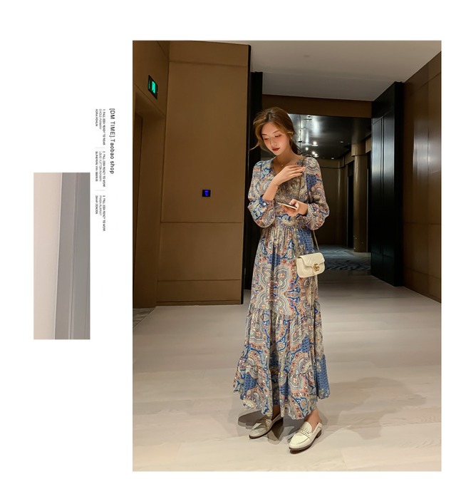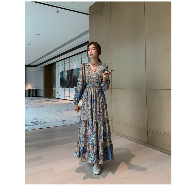 2020秋新作 プリントVネック長袖マキシ丈ワンピース。軽やかな素材でフェミニンに。お出かけはモチロン、シワにならないので旅行などにも便利。