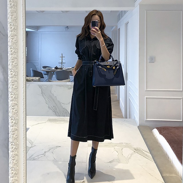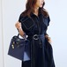 2020秋 新作 トリミングのステッチワークがポイントのシャツワンピース。さわやかな印象を残したい時に着たい。
