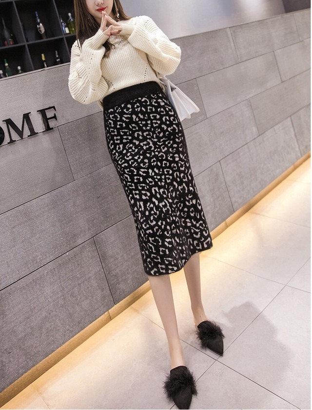 2020秋冬 ニット素材 ミドル丈 ヒョウ柄スカート ハイウエストなので足長効果が抜群