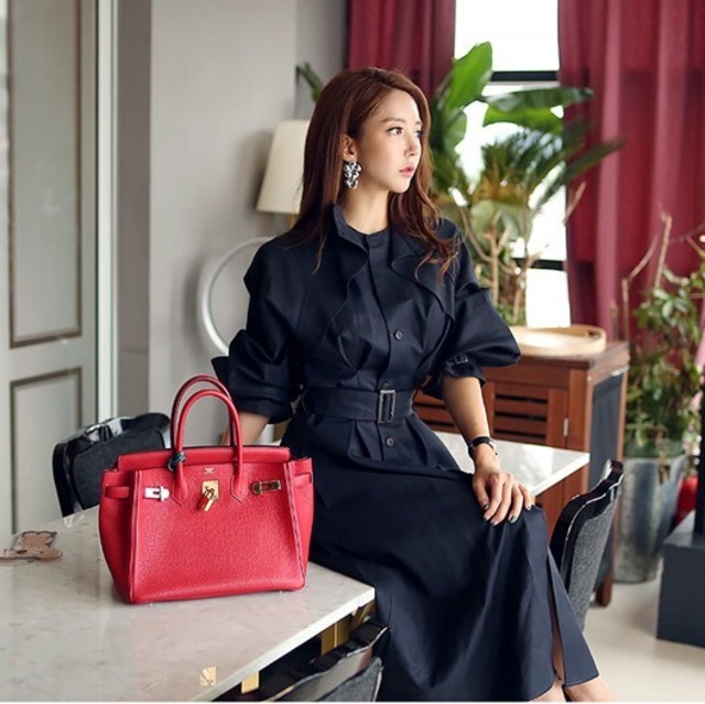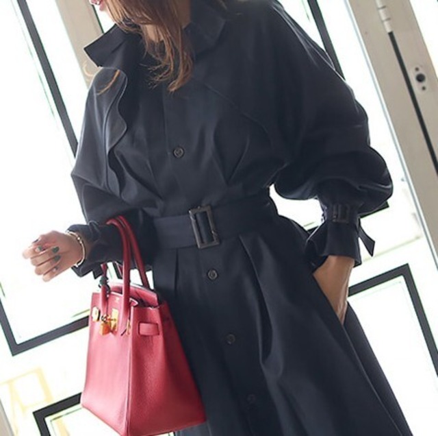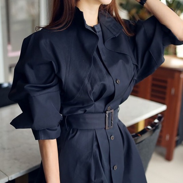 スタンドカラーのシャツワンピース。上品に見せたい時に。セレブ感、高見えで好感度アップ。