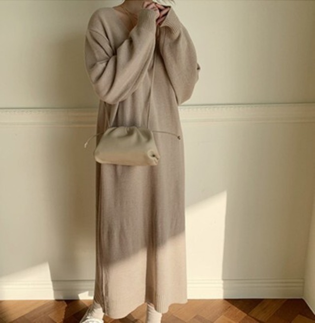 2020秋 トレンド ニットワンピース Vネック ミドル丈