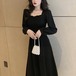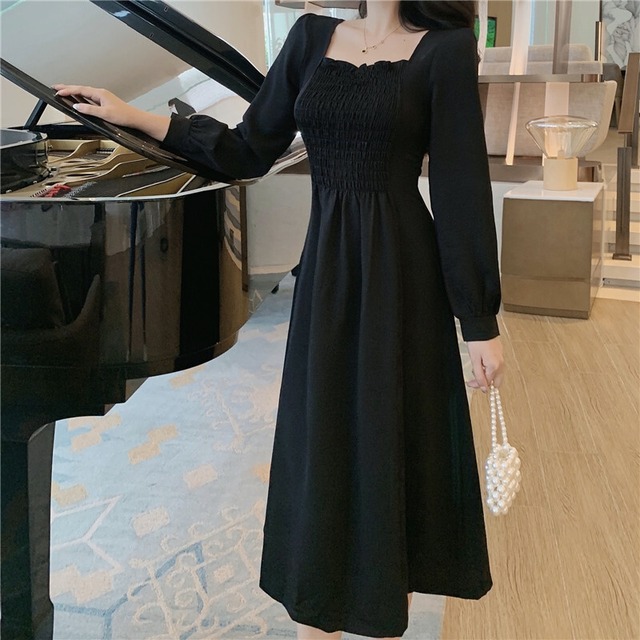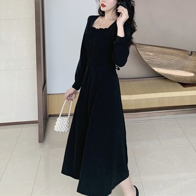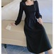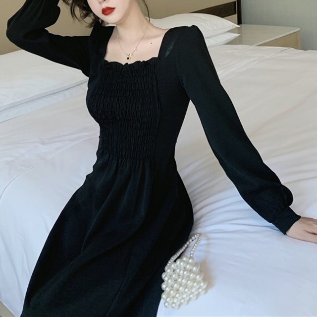 スクエアカラーのシャーリングがポイントのミドル丈、ブラックワンピース。