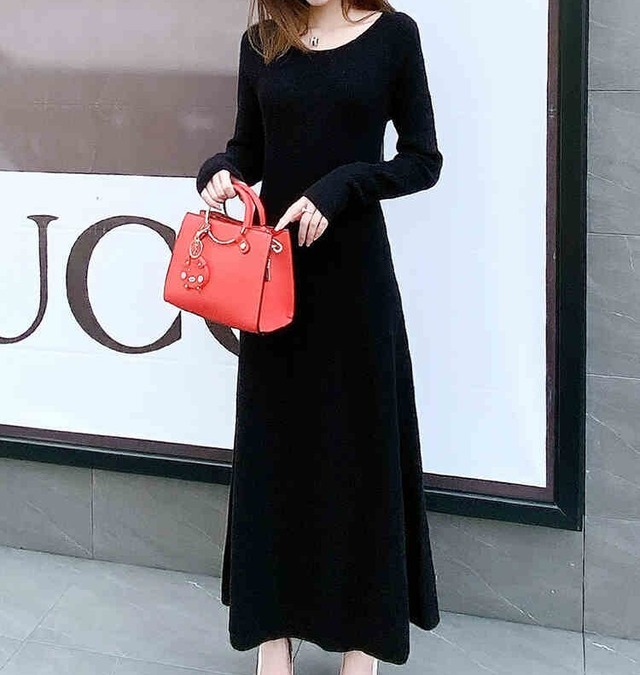 ラウンドネックのロングワンピース。Aラインのスカートでやさしいニュアンス。小物はビビッドな色を効かせてセンスアップ。