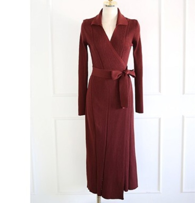 ハイゲージニットなので高見えするワンピース。襟元のデザインやウエストリボンでフェミニンな中にもキチンと感あり。。