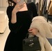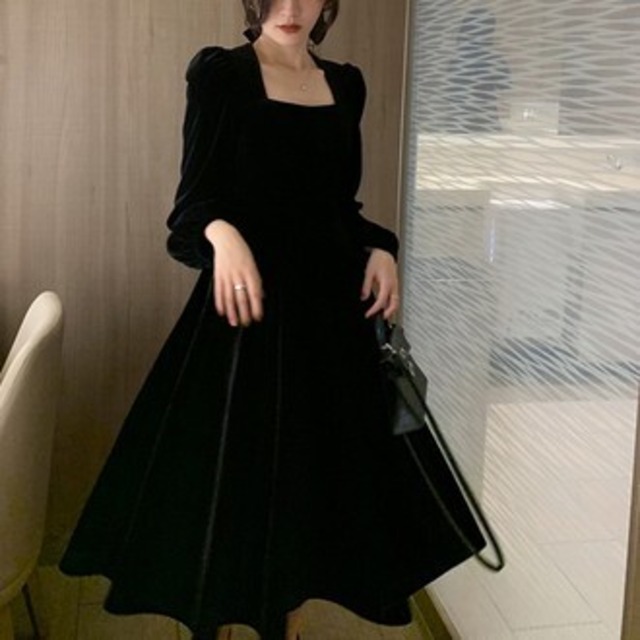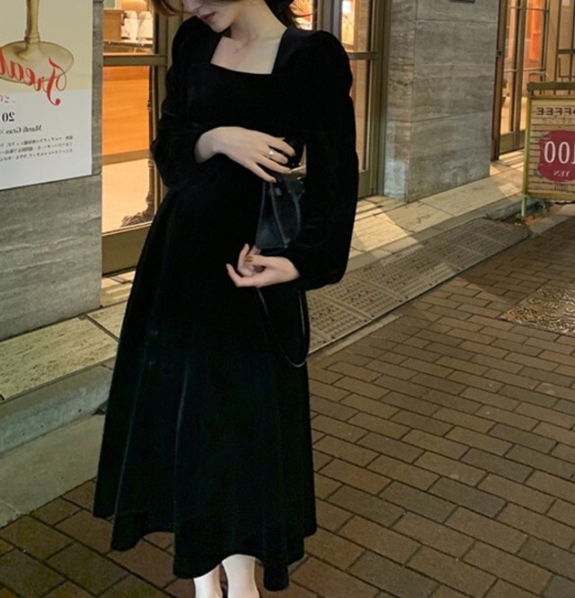 ミドル丈のベルベットワンピース。スクエアカラーやパフスリーブが今年っぽい。。!大人カワイイワンピース。