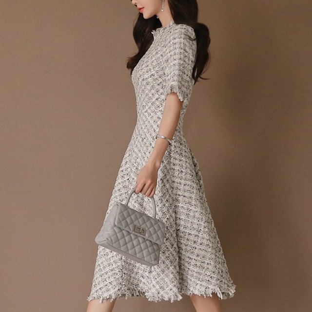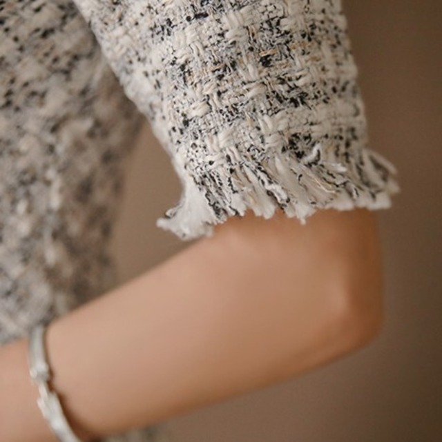 ツィード素材に甘さを加えたAラインワンピースに仕上げました。おめかししてお出かけしたい時にイイですよね。。!