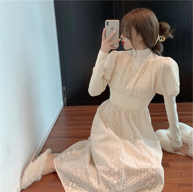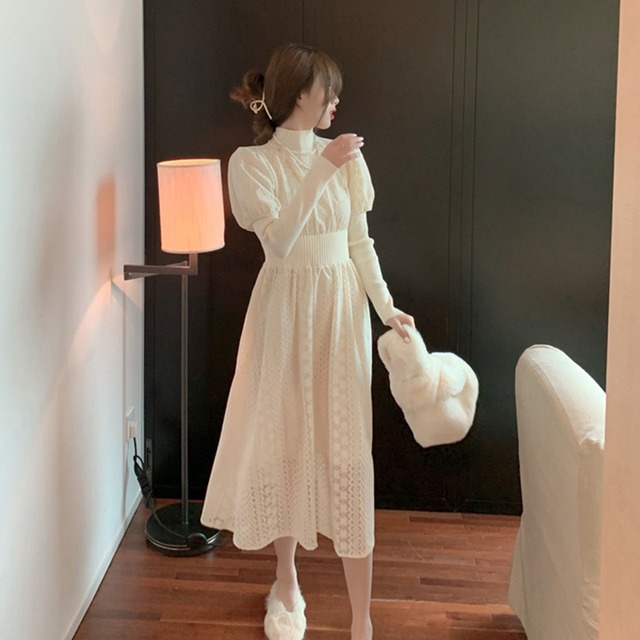 パフスリーブが愛らしいレースワンピース。袖下とウエストマークのデザインで足長効果も。。