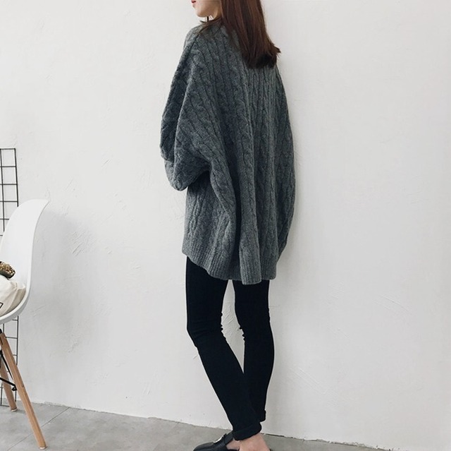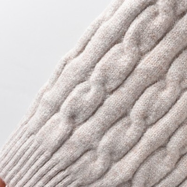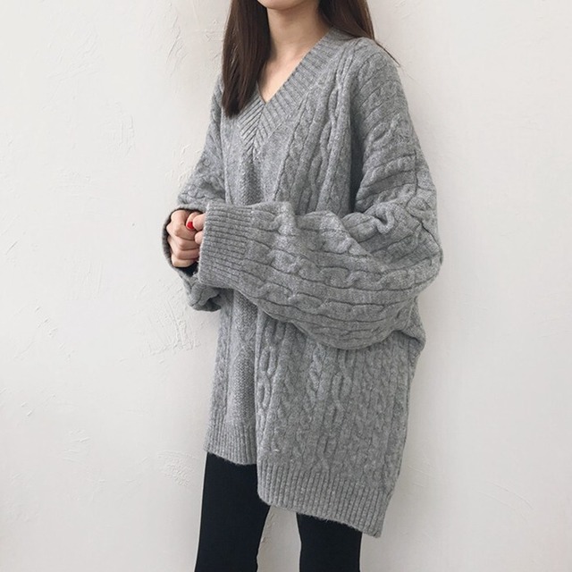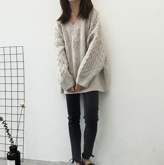 ケーブル編みでVネックの大きめプルオーバー。スリムなジーンズなどと高相性♡後ろが少し長めなので気になるヒップもしっかりカバー♡