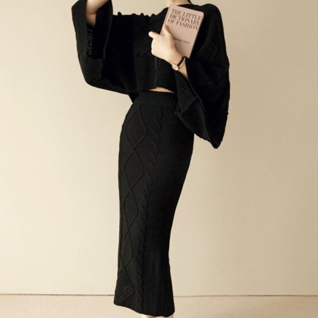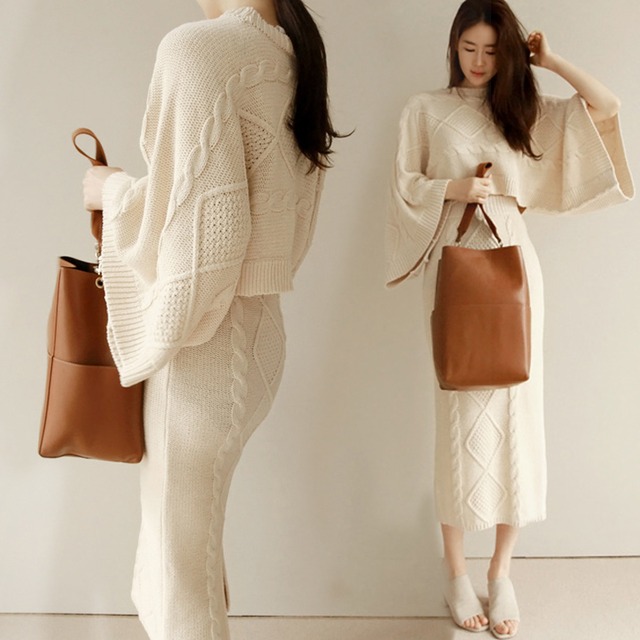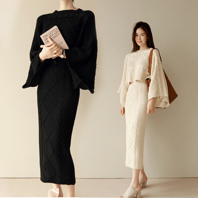 ショート丈のプルーオーバーとロング丈のスカートのニットセットアップ。
