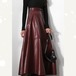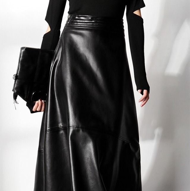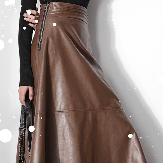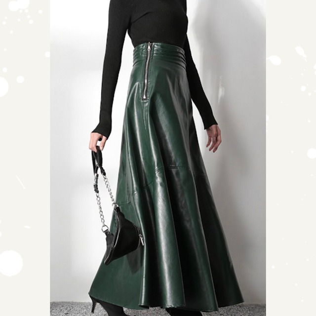 レザーのロングスカート。PU素材なのでお天気を気にしないで安心。Aラインだからどんなコーデにもなじみやすい♡