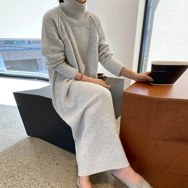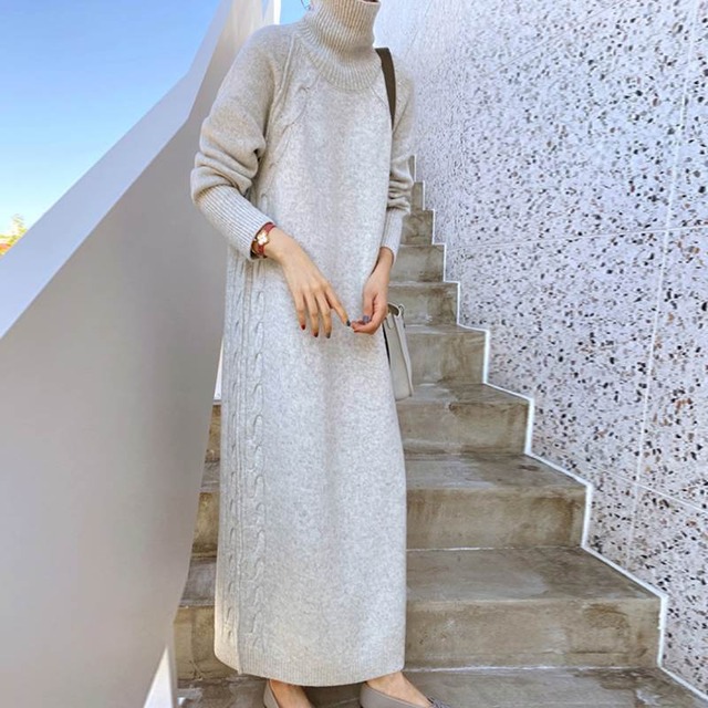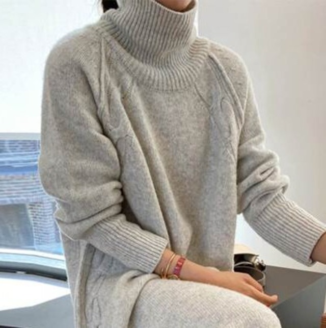 肩からサイドにかけて入ったケーブル編みがオシャレなニットワンピース♡ライトグレーが春っぽい♡
