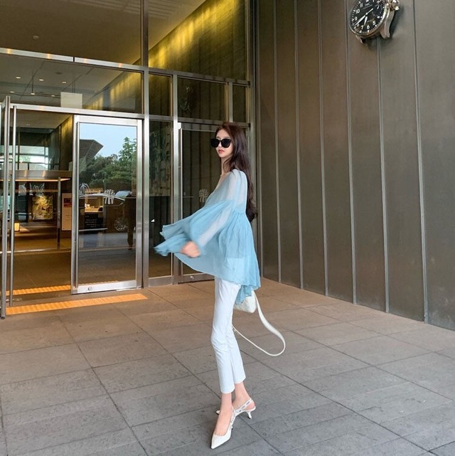 グレイッシュなライトブルーで春気分のブラウス♡シルエットと透け感がステキ♡王道な白パンツと合わせたい♡