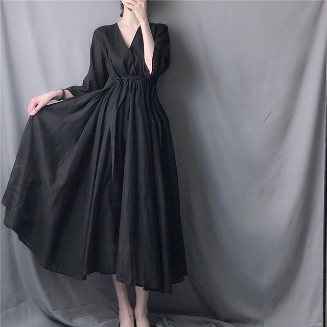 裾幅がたっぷりしたVネックのワンピース♡コットンなので軽やかな仕上がり♡春先に一番に着たい♡