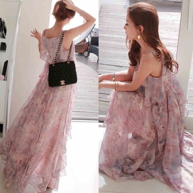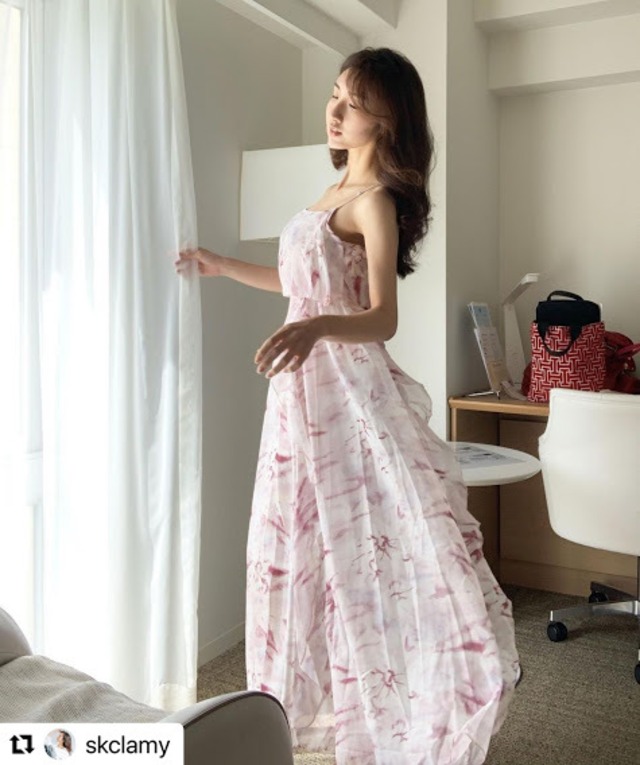 春色がカワイイ、パープルピンクの花柄シフォンロングワンピース♡フェミニンさが際立ちます♡