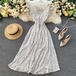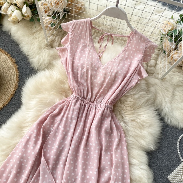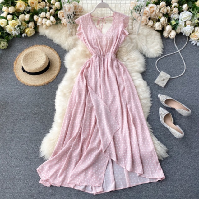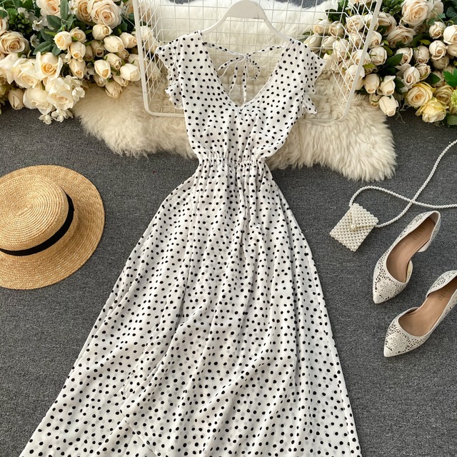 フェミニンな水玉のワンピース♡ネックの後ろ結びリボンや袖のフリル、イレギュラーデザインのスカートなどがシンプルの中のやさしさを引き出します♡