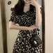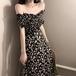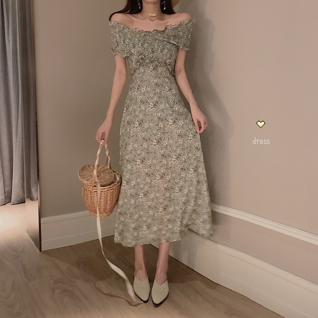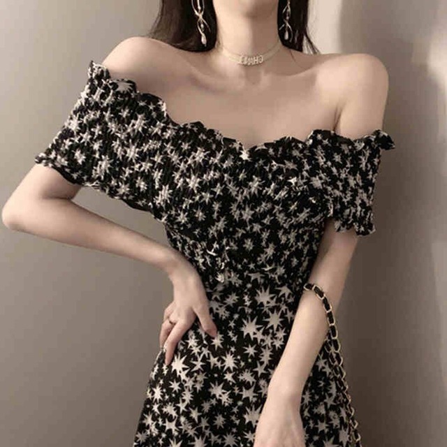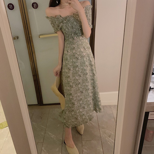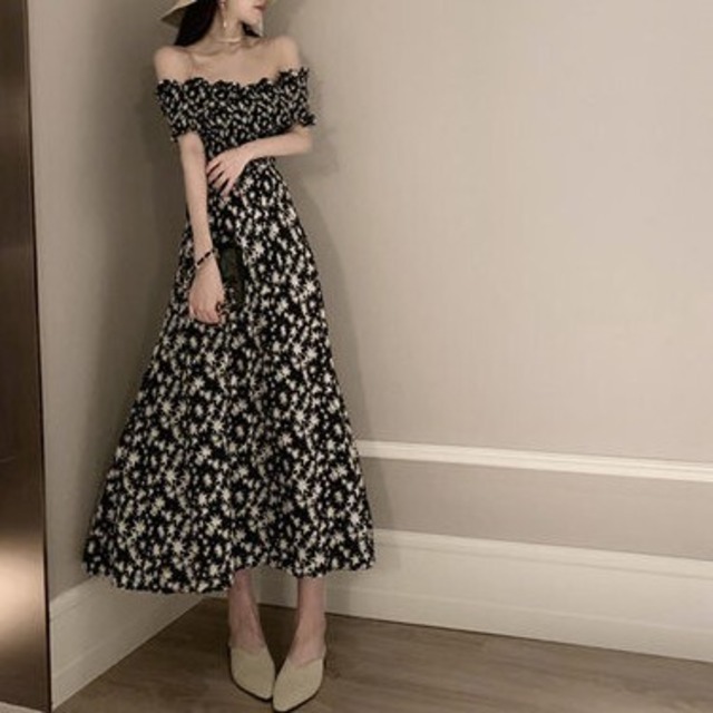 肩から胸元にかけてクロスしたシャーリングのデザインがカワイイワンピース♡肩を見せても見せなくてもステキにまとまります♡グリーン系の花柄とブラック系の星柄でイメージ違いも楽しめます♡