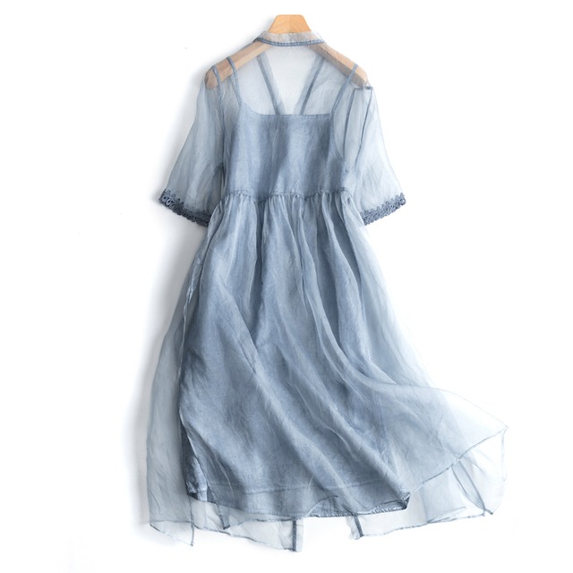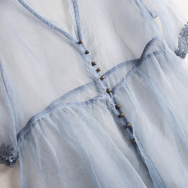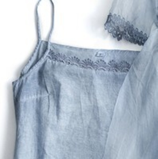 オーガンジー素材でレイヤードするワンピース♡キャミワンピは別に着ても♡ネックや袖のレース使いや小さな釦、どれをとっても繊細な仕上がり♡