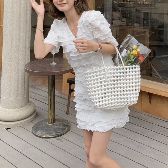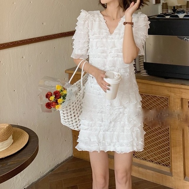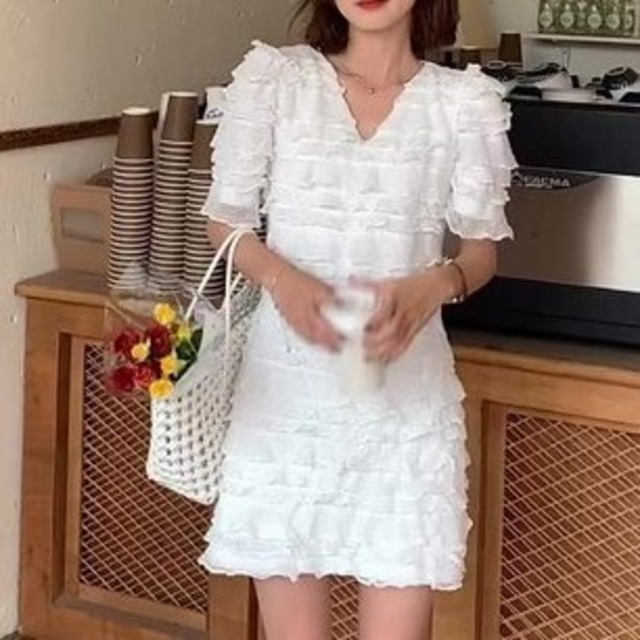 レース素材が幾重にも重なったデザインの生地が、甘くカワイイワンピース♡Vネックで半袖です♡