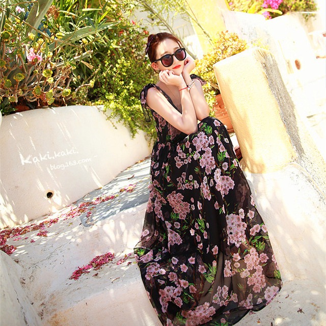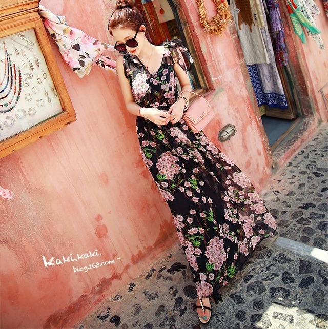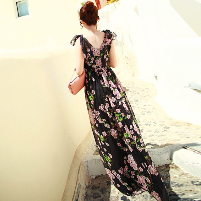 大ぶりの花柄だけどブラックだから大人シックなワンピース♡色の感じやシフォンの柔らかさもセンスアップ♡