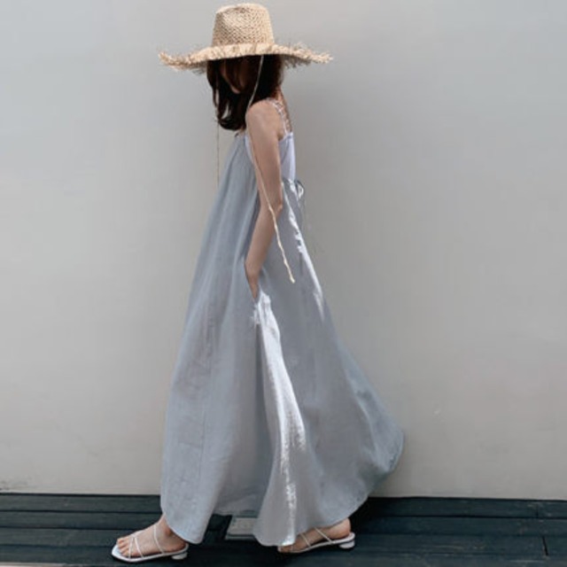 コットンリネンのキャミワンピース♡ルーズな「Aライン」と儚げな「ライトブルー」が涼し気♡インナーとのコーデで着回しも♡