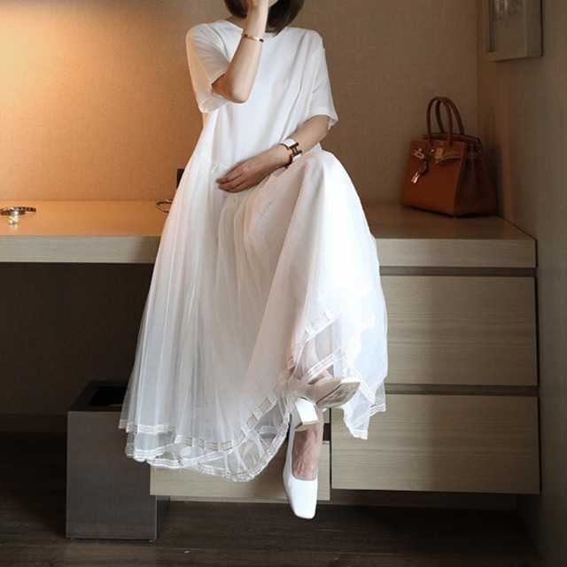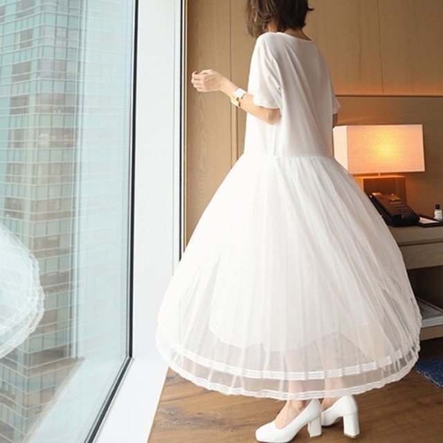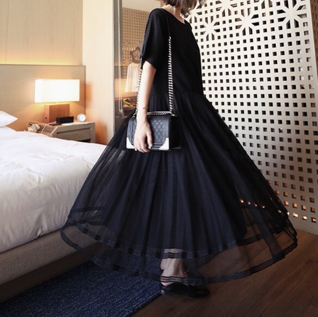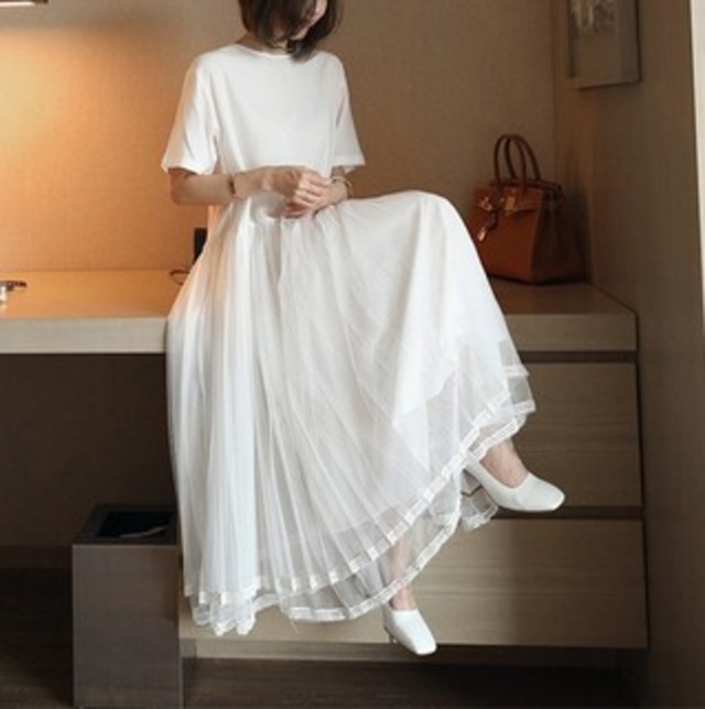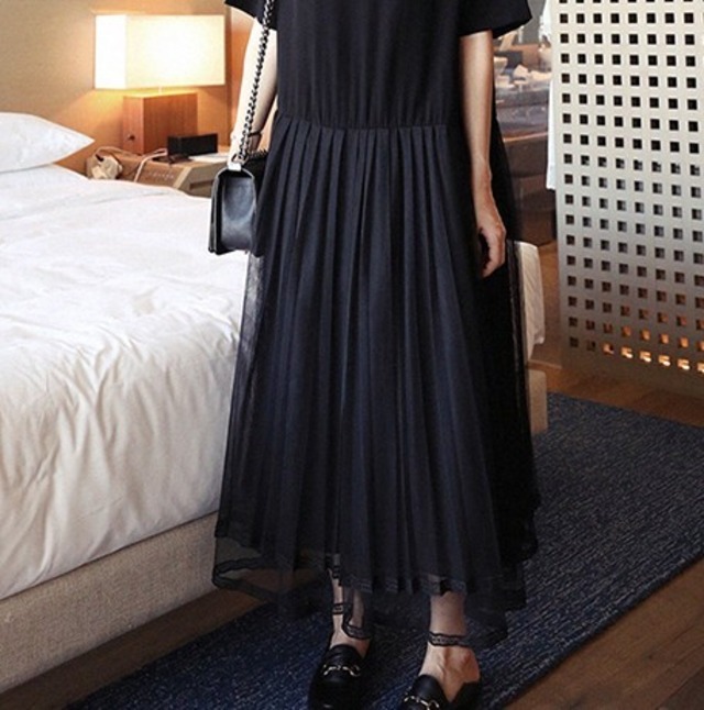 プリーツメッシュのスカートがエレガント♡ルーズハイウエストでラクチンなシフォンのワンピース♡