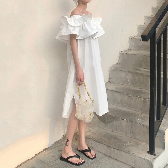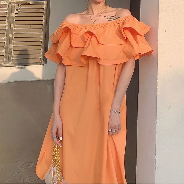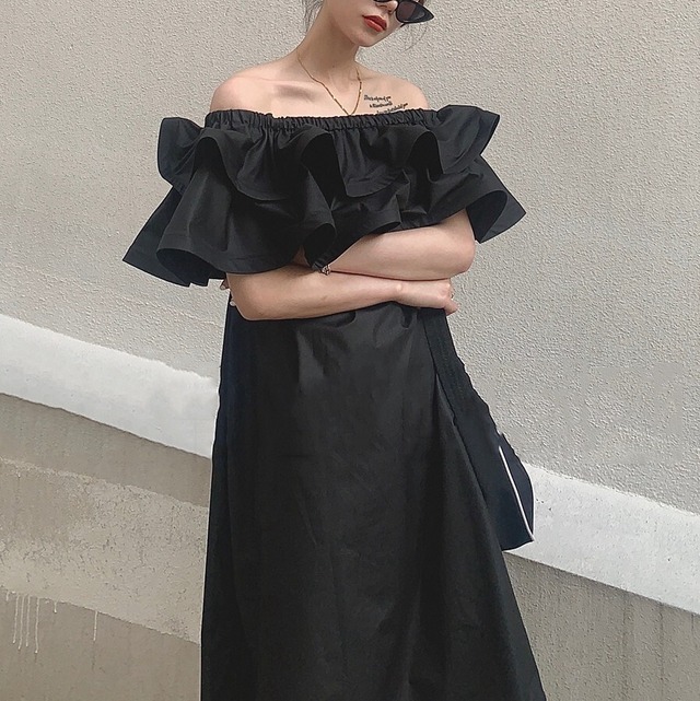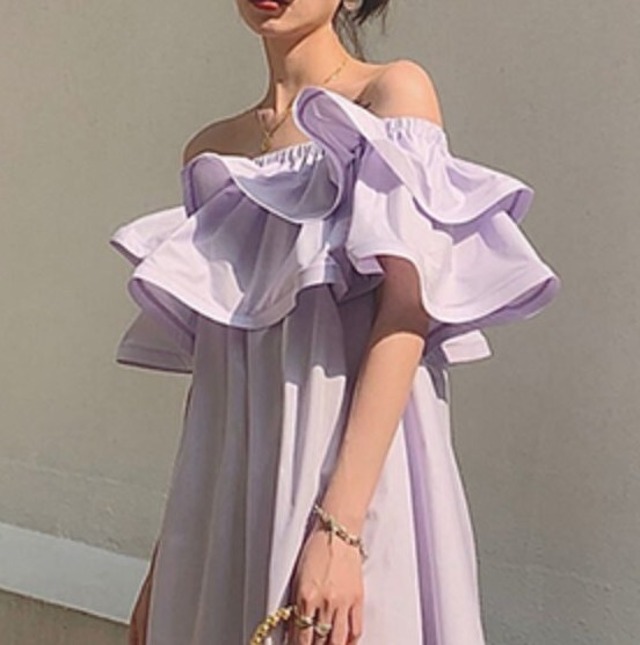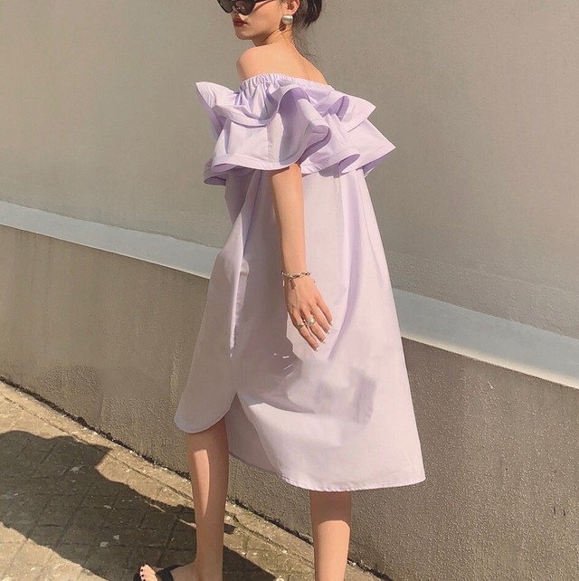 フリルのオフショルダーがかわいいワンピース♡ミドル丈で着回ししやすい♡