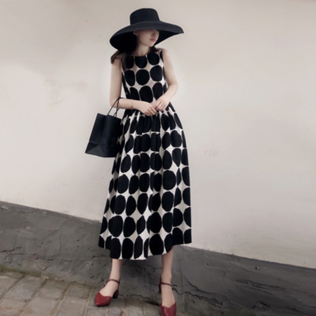 大きな水玉のノースリーブワンピース♡アートっぽい柄がポイント♡