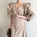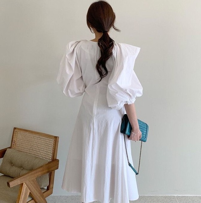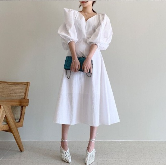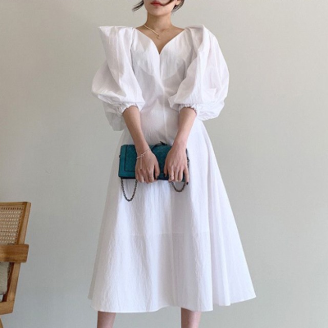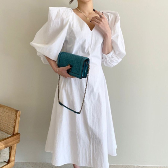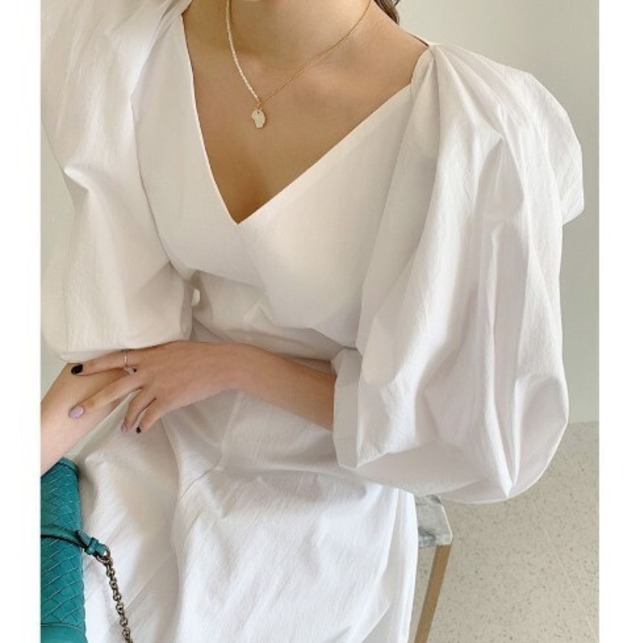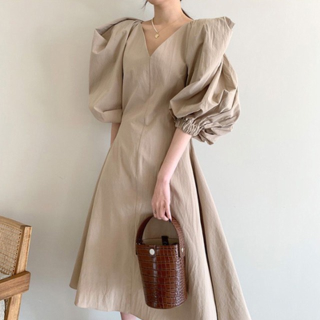 パフスリーブでVネックのシックなワンピース♡シンプルなデザインが上品♡