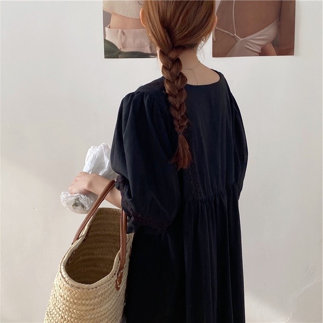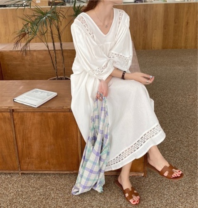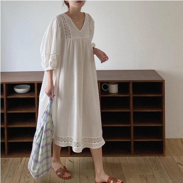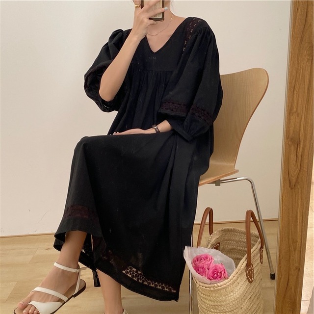 レーステープ使いがポイントのワンピース♡Ⅴネックで5分袖♡このルーズ感がカワイイ♡