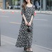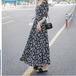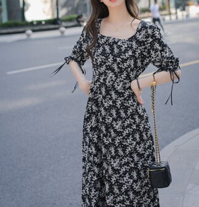 モノトーンの花柄。シフォンのロングワンピース♡パフスリーブの袖口のリボンもカワイイ♡