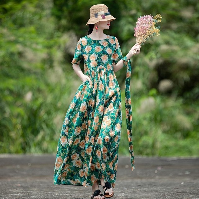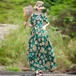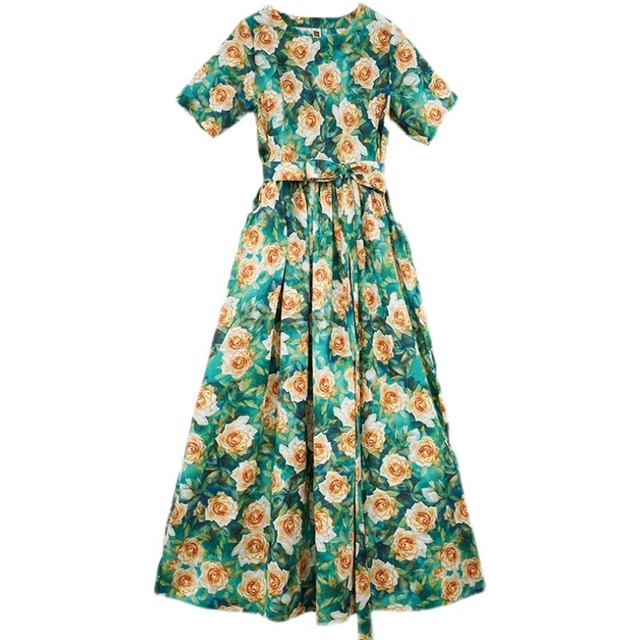 ノスタルジックな花柄のロングワンピース♡スラウンドネックで半袖♡シックにな雰囲気に♡