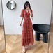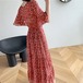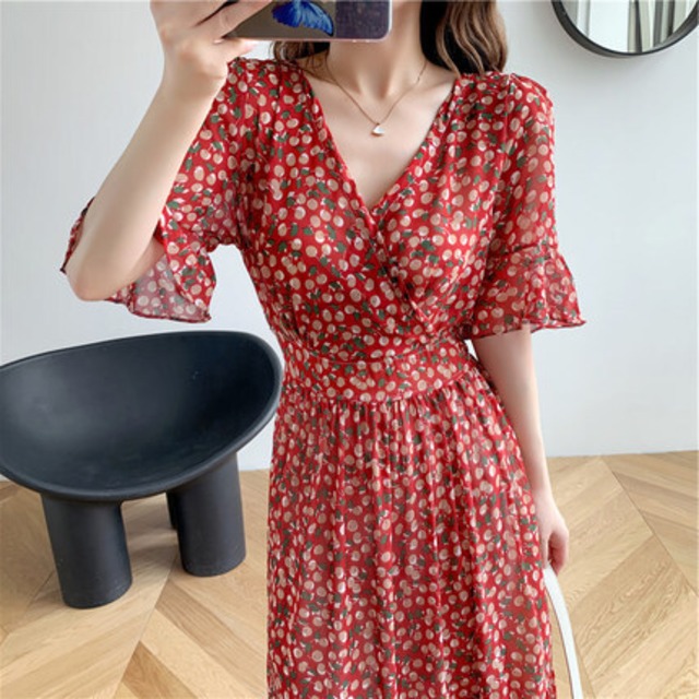 小花柄がカワイイ♡半袖のフリルスリーブのロングワンピース♡Vネックのカシュクールのデザインはやせ見え効果あり♡