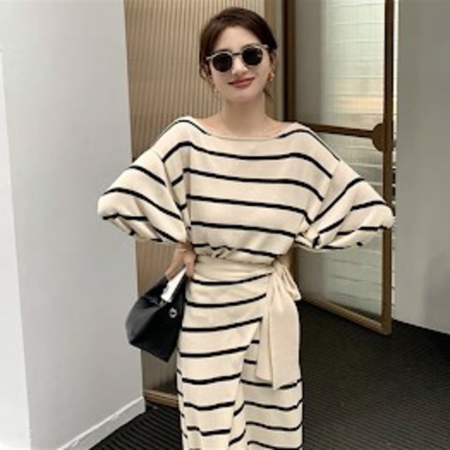 パフっぽい9分袖がカワイイ、ボーダーのワンピース♡こういう袖丈の方が実は使いやすくってコーデによってはオールシーズンかも♡