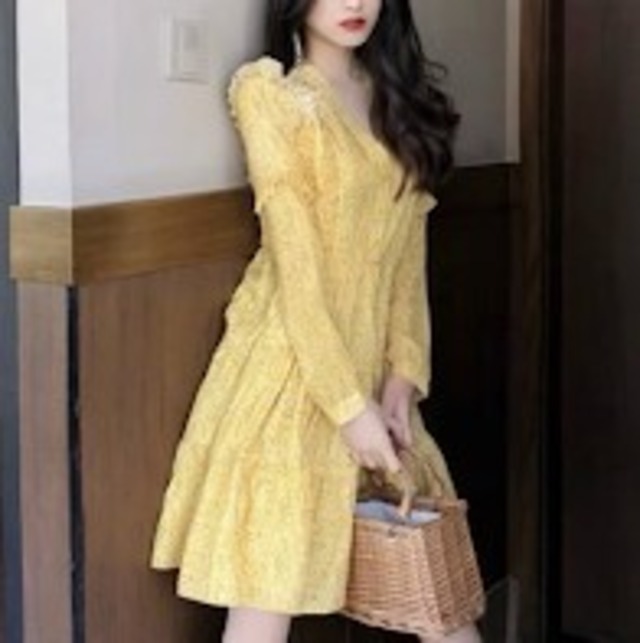 やさしい黄色の花柄のワンピース♡シフォンのやわらかいイメージがやさしさをアップ♡ミドル丈で着回ししやすい♡