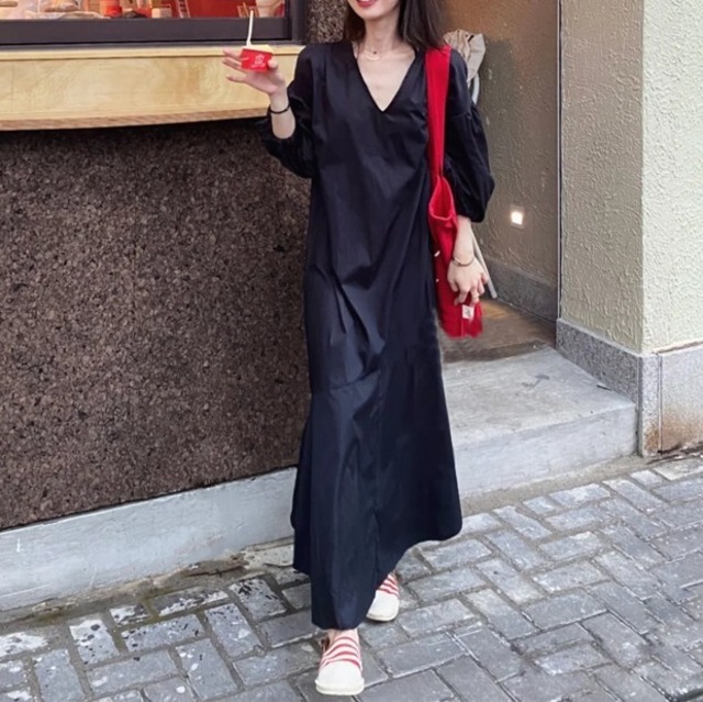 シンプルなブラックのルーズワンピース♡Vネックやダウンショルダー、ランタンスリーブもさりげなくトレンド♡小物系のカラーでアクセントが付けやすい♡カジュアルにもドレスアップにも着こなせる便利アイテム♡
