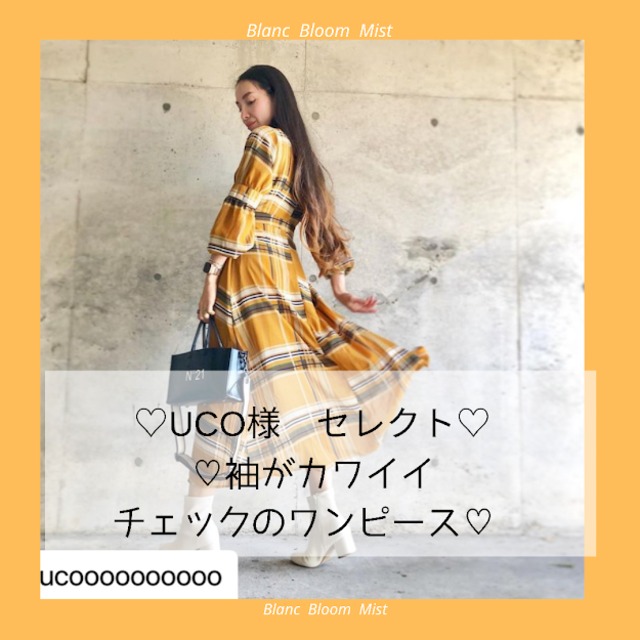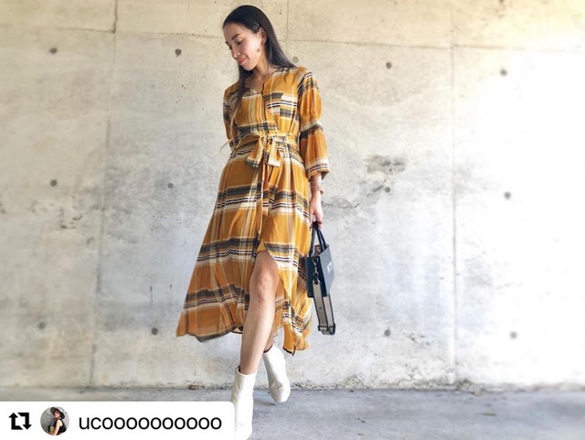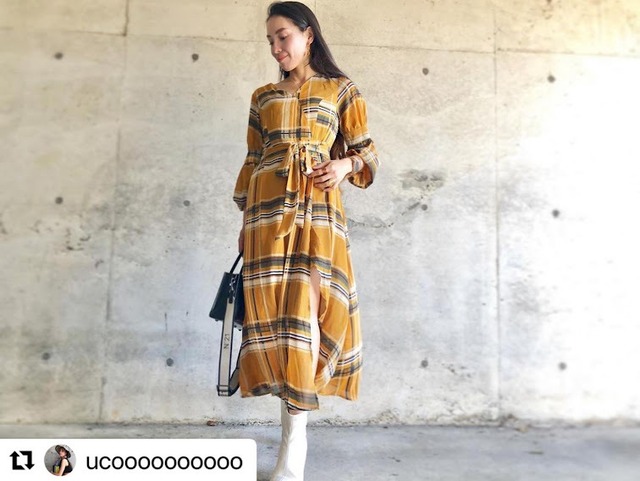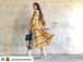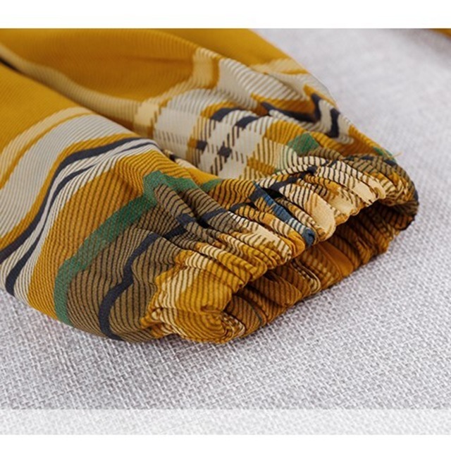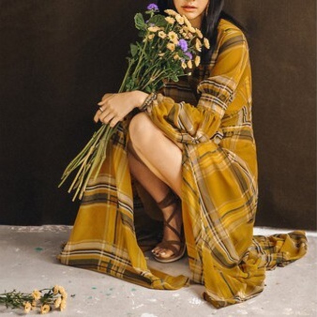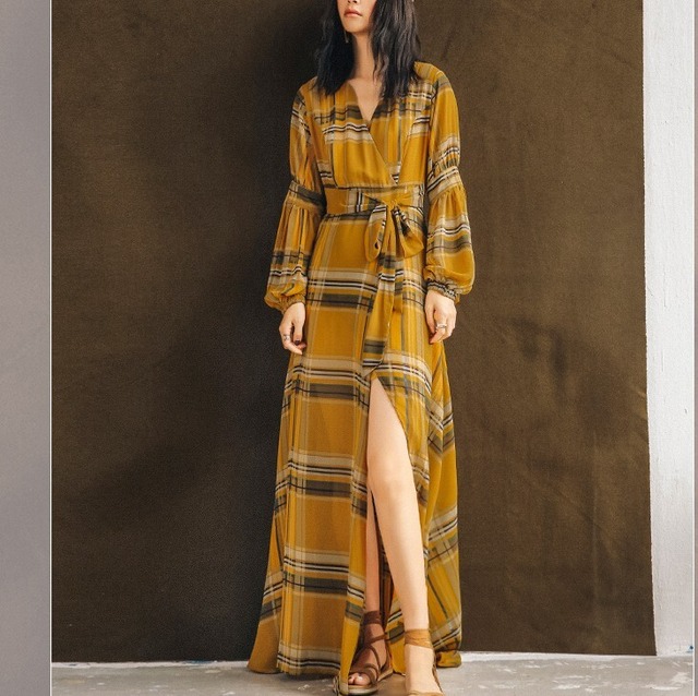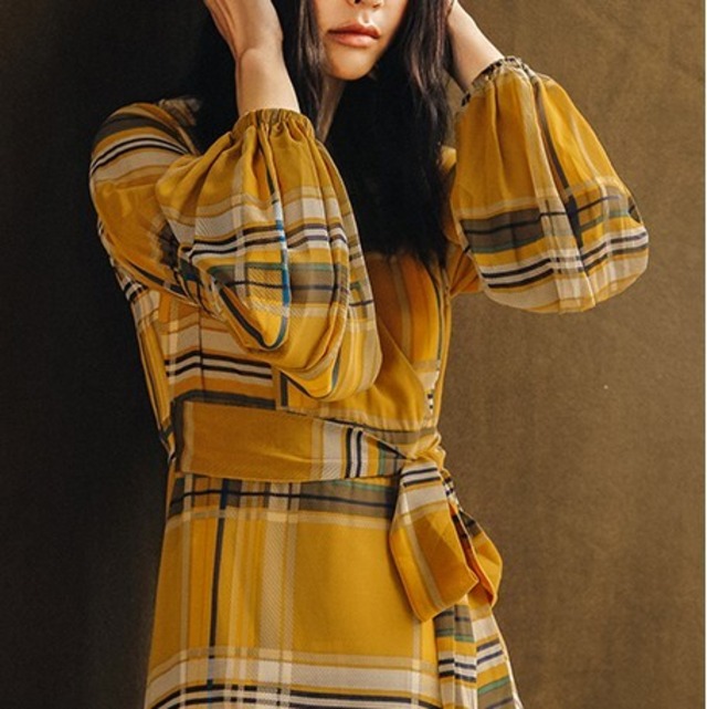 秋色イエロー系チェックのロングワンピース♡シフォン素材でランタンスリーブやVネックが女らしい♡