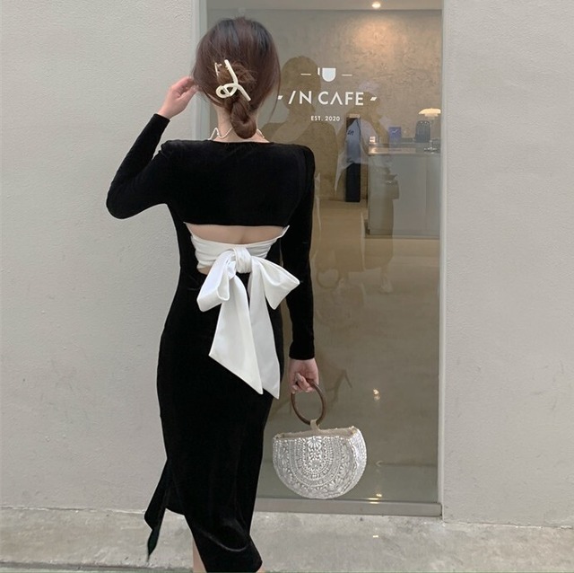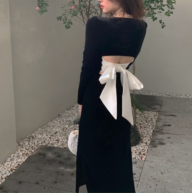 ベルベットが上品♡スクエアネックのワンピース♡バックで結んだリボンで魅力的に印象付けて♡