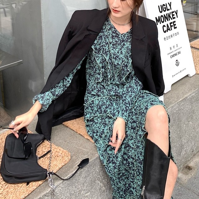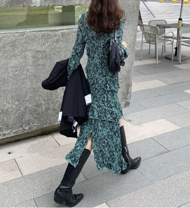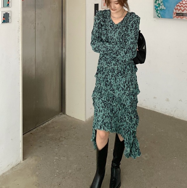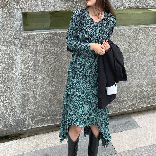 イレギュラーな裾の長さが印象的なプリントのワンピース♡Vネックが華奢な感じを強調♡全体に施したプリーツもルーズシルエットをステキに演出♡