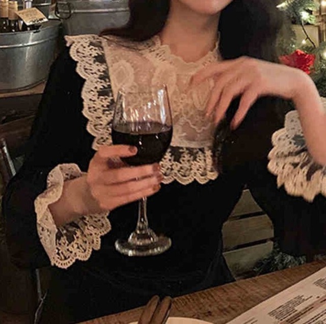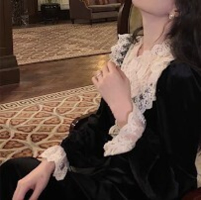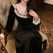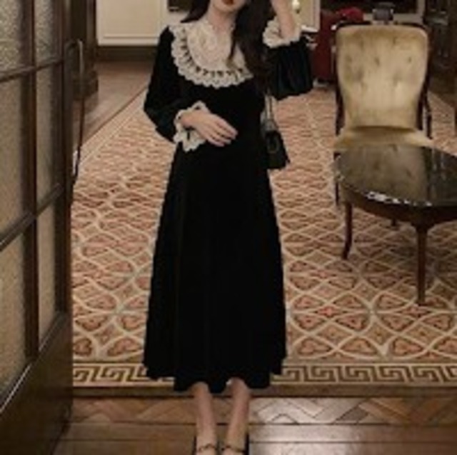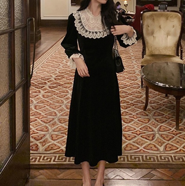 ネックラインや袖口にあしらったレースがとってもレトロで清楚♡ベルベットのワンピース♡
