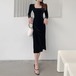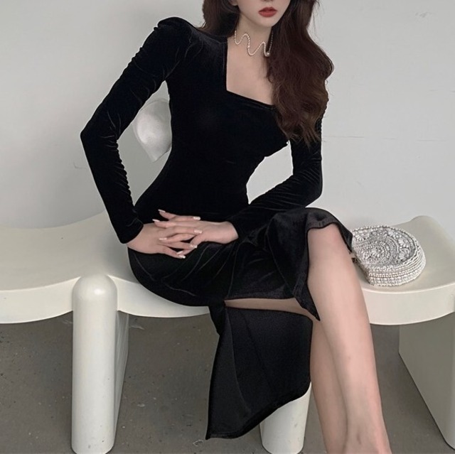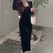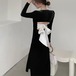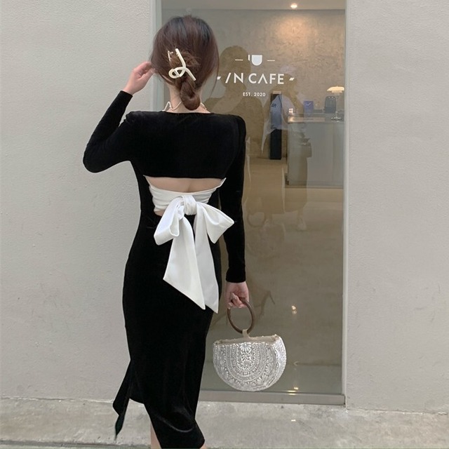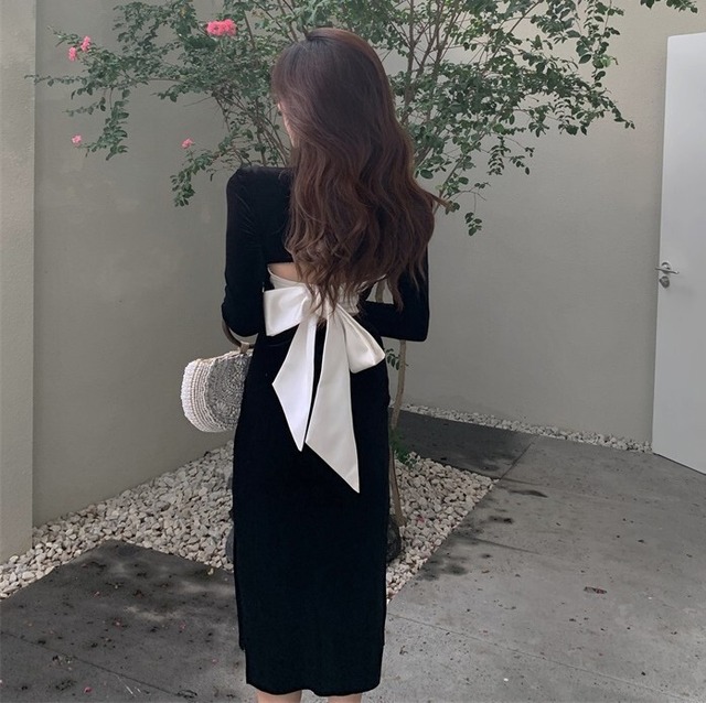 後ろの白いリボンが印象的♡スクエアネックの黒いワンピース♡敢えて白いバッグと合わせるとエレガントに♡