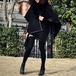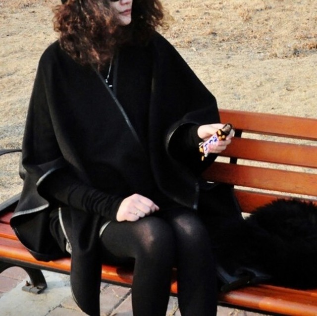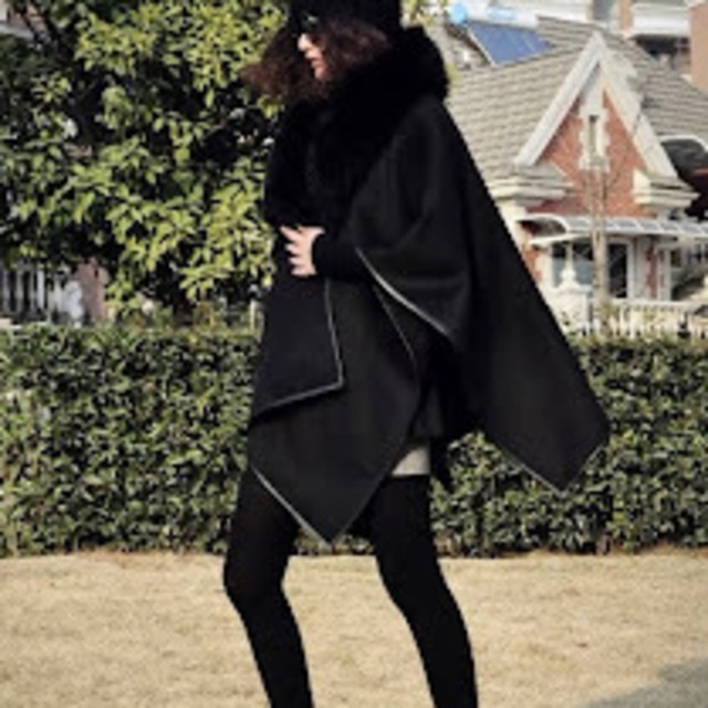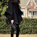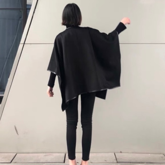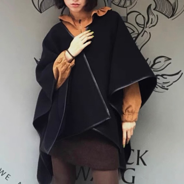 レザーパイピングでくるまれたフランネル素材のショール風マントコート