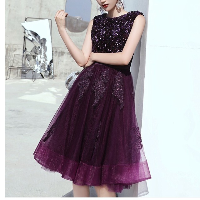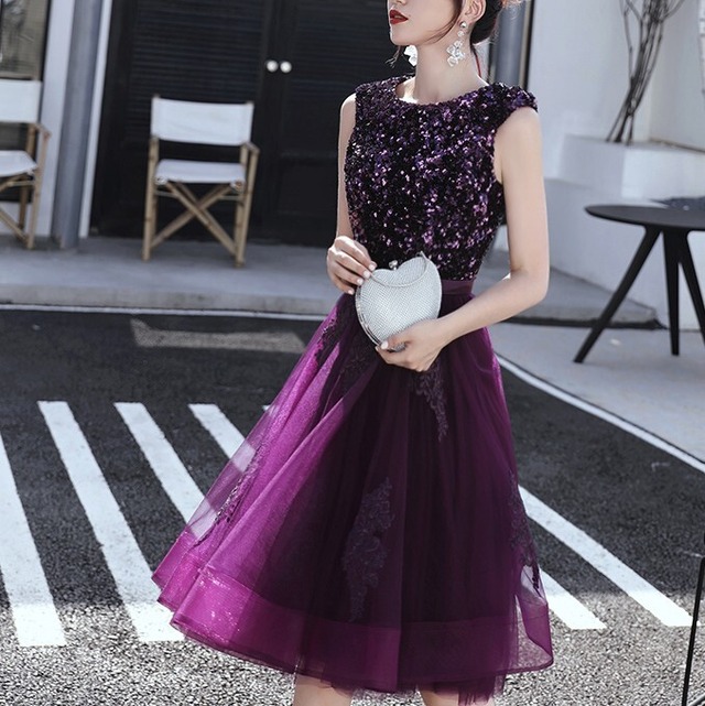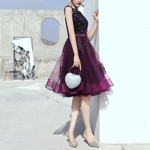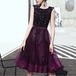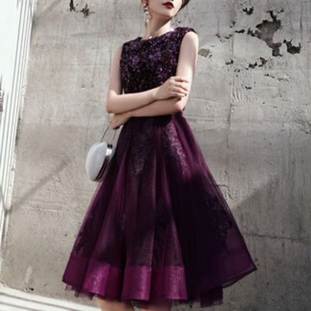 スパンコールとシアーなスカートの刺繍がゴージャスなパープルのイブニングドレス♡スカートのフレアー感もこの雰囲気にピッタリ♡